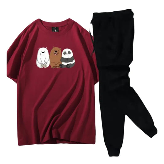Maroon Trendy Cute 3 Bear Printed Tracksuit For Girls & Womens - Soft & Comfortable Fabric T Shirt & Trouser Summer Wear Tracksuit By OUTFITTERS 2.0